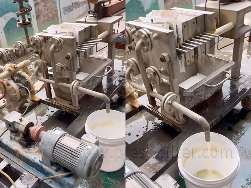 Starting the filter press: Turning on the plate and frame stainless steel filter press, the equipment further presses the sugar residue under high pressure, so that the sugar juice seeps out of the filter cloth. The high pressure of the plate and frame stainless steel filter press can greatly reduce the moisture content of the sugar residue and achieve the ideal dehydration effect.